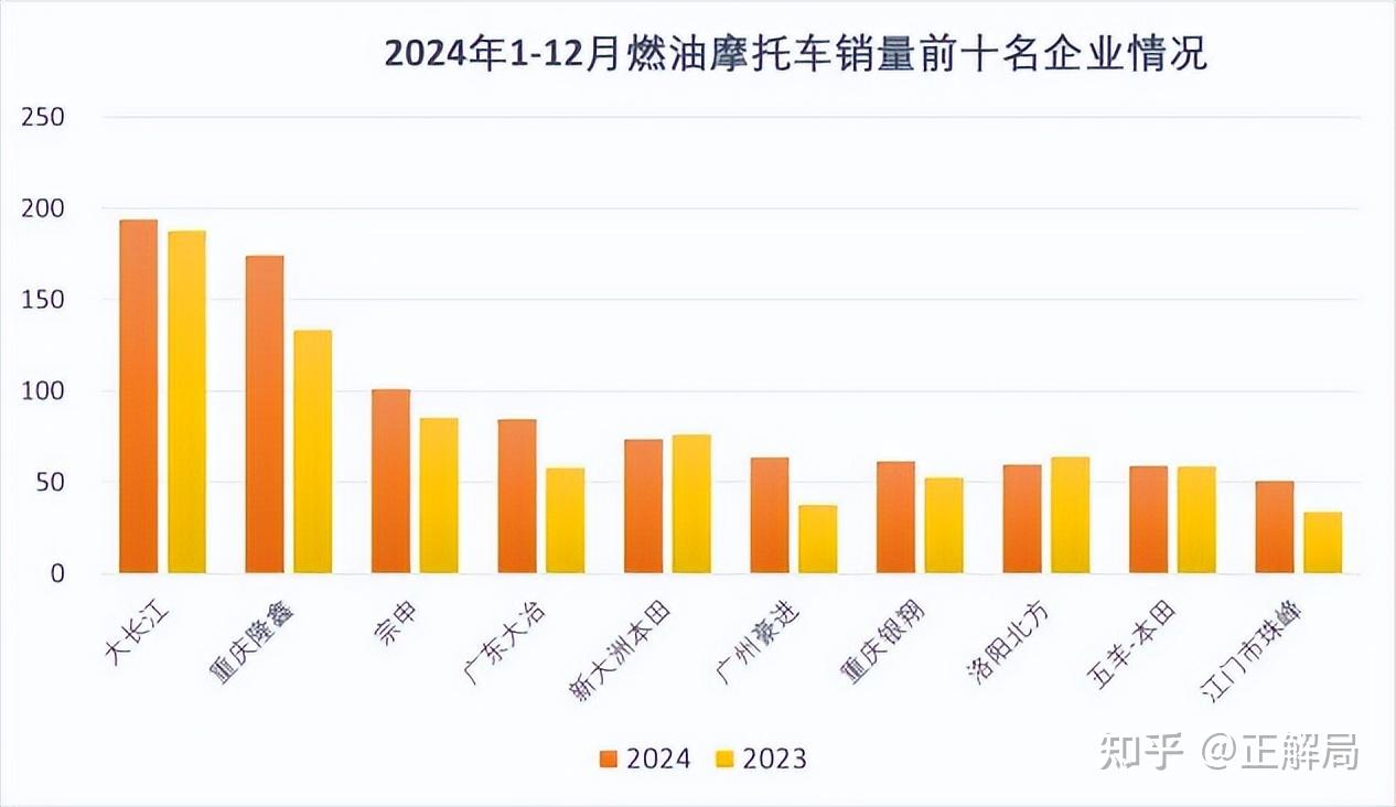 2024年全球摩托车销量十强中,豪爵、隆鑫、宗申三家中国企业跻身前十。